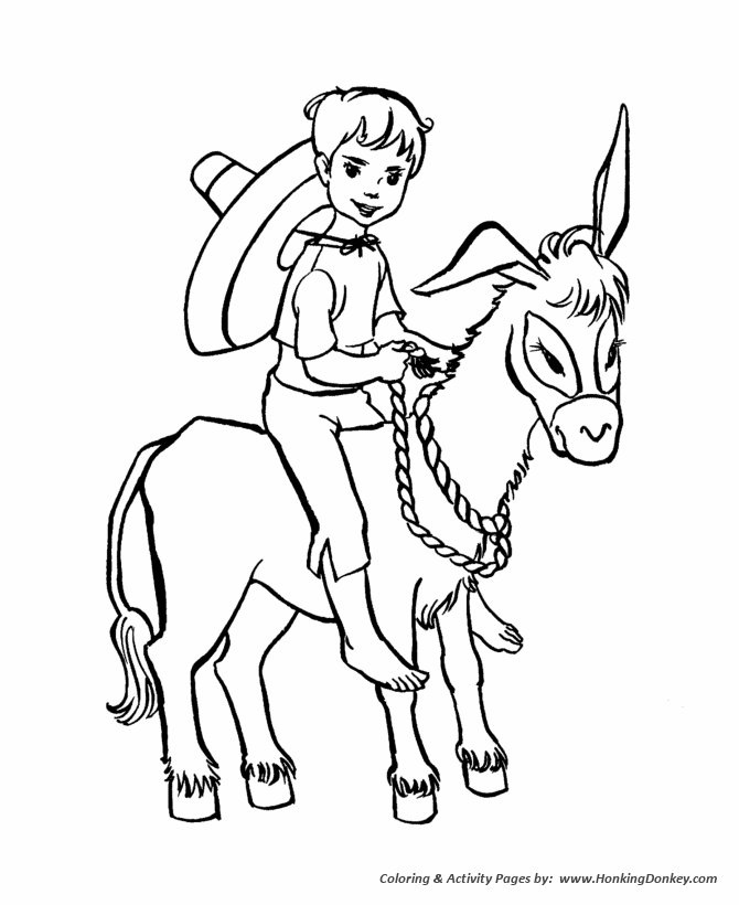 Here is a coloring page of a cute little boy riding on his little donkey.