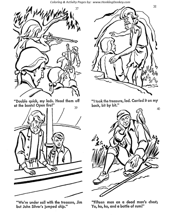 These classic adventure pirate tale coloring pages display a picture from the story and a printed caption to tell part of the story.